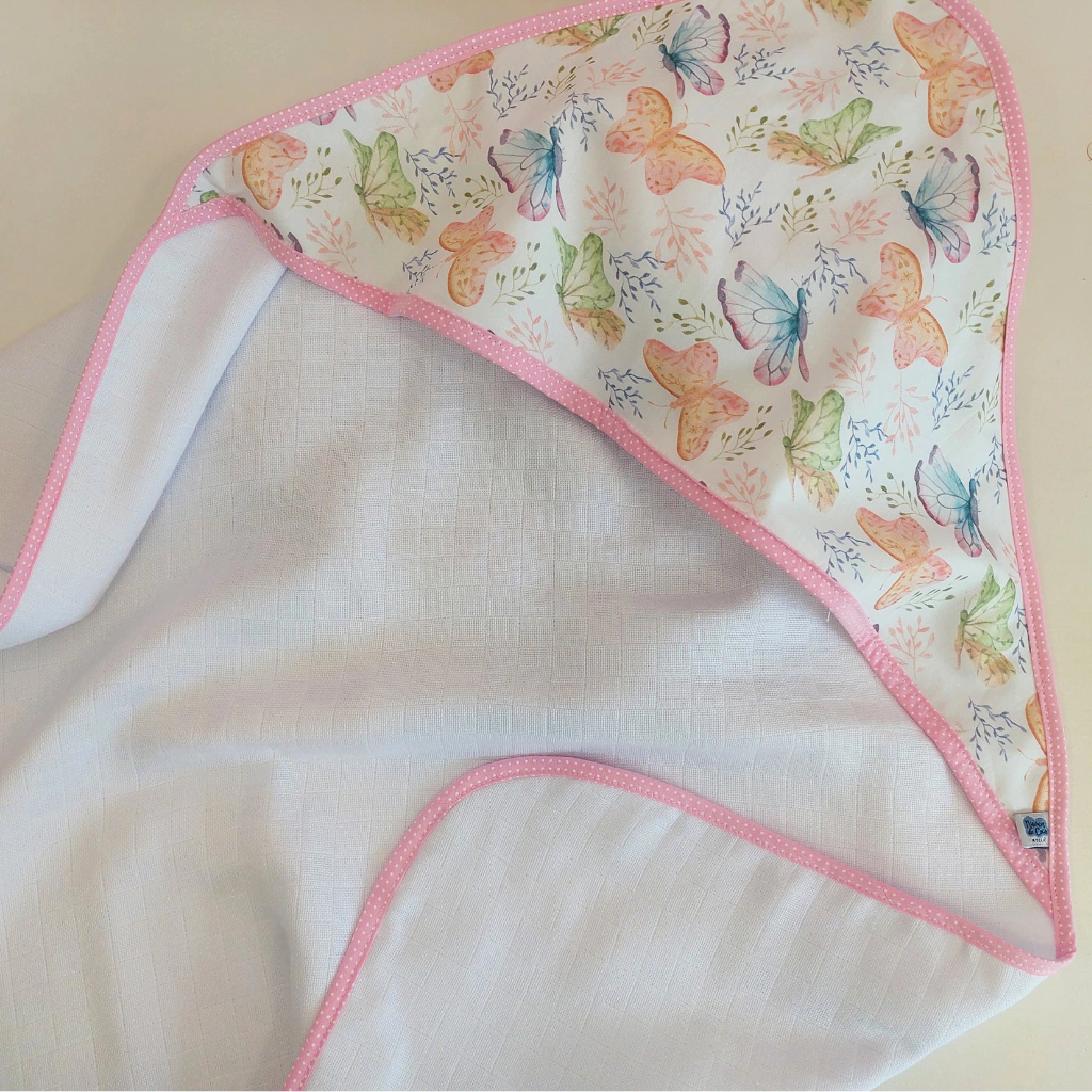O capuz é estampado e forrado com fralda, enquanto o acabamento em tecido de algodão ao redor da toalha garante um toque final de qualidade.